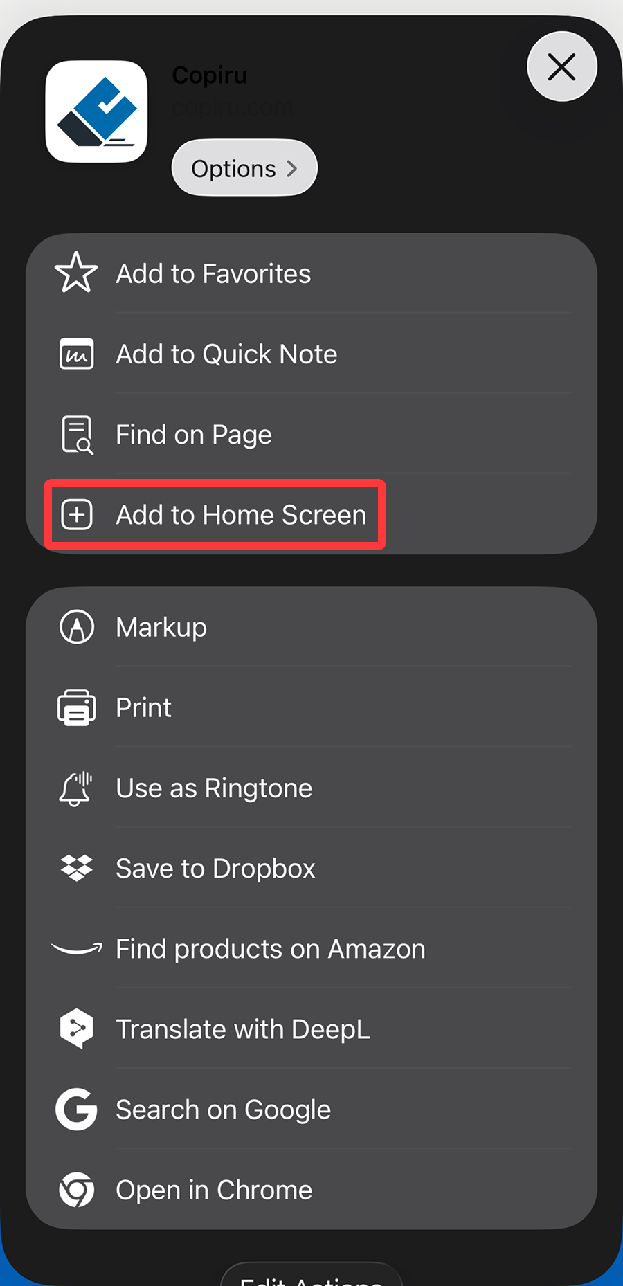 - From the menu that appears, select “More,” then “Add to Home Screen.”