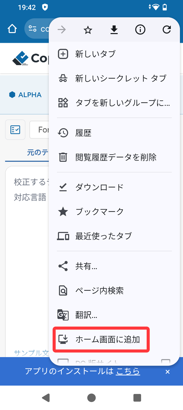 ※一部のブラウザでは「インストール」ではなく「ホーム画面に追加」など、異なる文言で表示されます。
