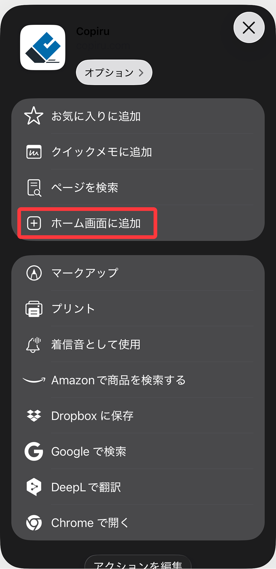 - 表示されたメニューから「ホーム画面に追加」を選択します。